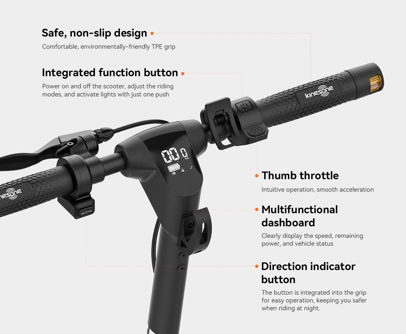 - Controles: Acelerador de polegar e botões integrados para indicadores de direção