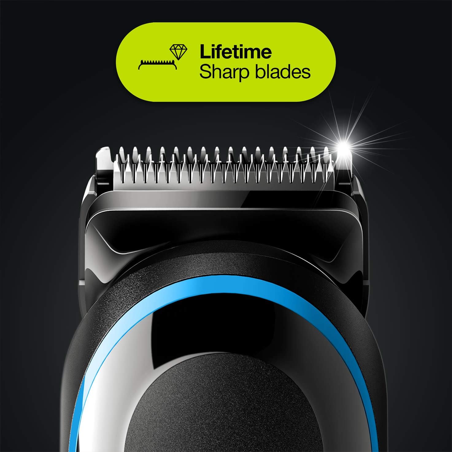 Aparador multifunções 9 em 1 para barba, cabelo e corpo. Lâmina ultra precisa, resistente à água e com bateria de longa duração. Ideal para todos os tipos de corte e zonas sensíveis.
