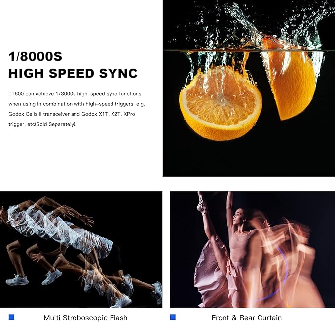 Sincronização de alta velocidade: Até 1/8000s (necessário gatilho Godox X1T, X2T, XPro ou Cells II – vendidos separadamente). Observação: não funciona em HSS quando montado diretamente na câmera.
