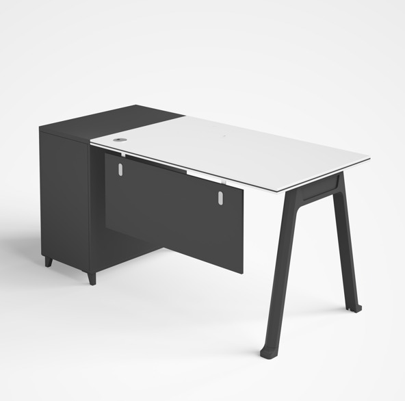 A mesa conta com uma perna metálica que proporciona firmeza extra e um armário fixo composto por 1 porta e 1 gaveta, permitindo organizar documentos, materiais de escritório e objetos pessoais.