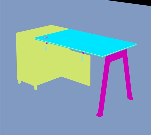 O tampo em melamina E1 de 25 mm oferece resistência a riscos e manchas, enquanto o painel frontal de 15 mm reforça a estabilidade da mesa.