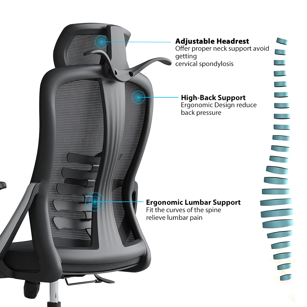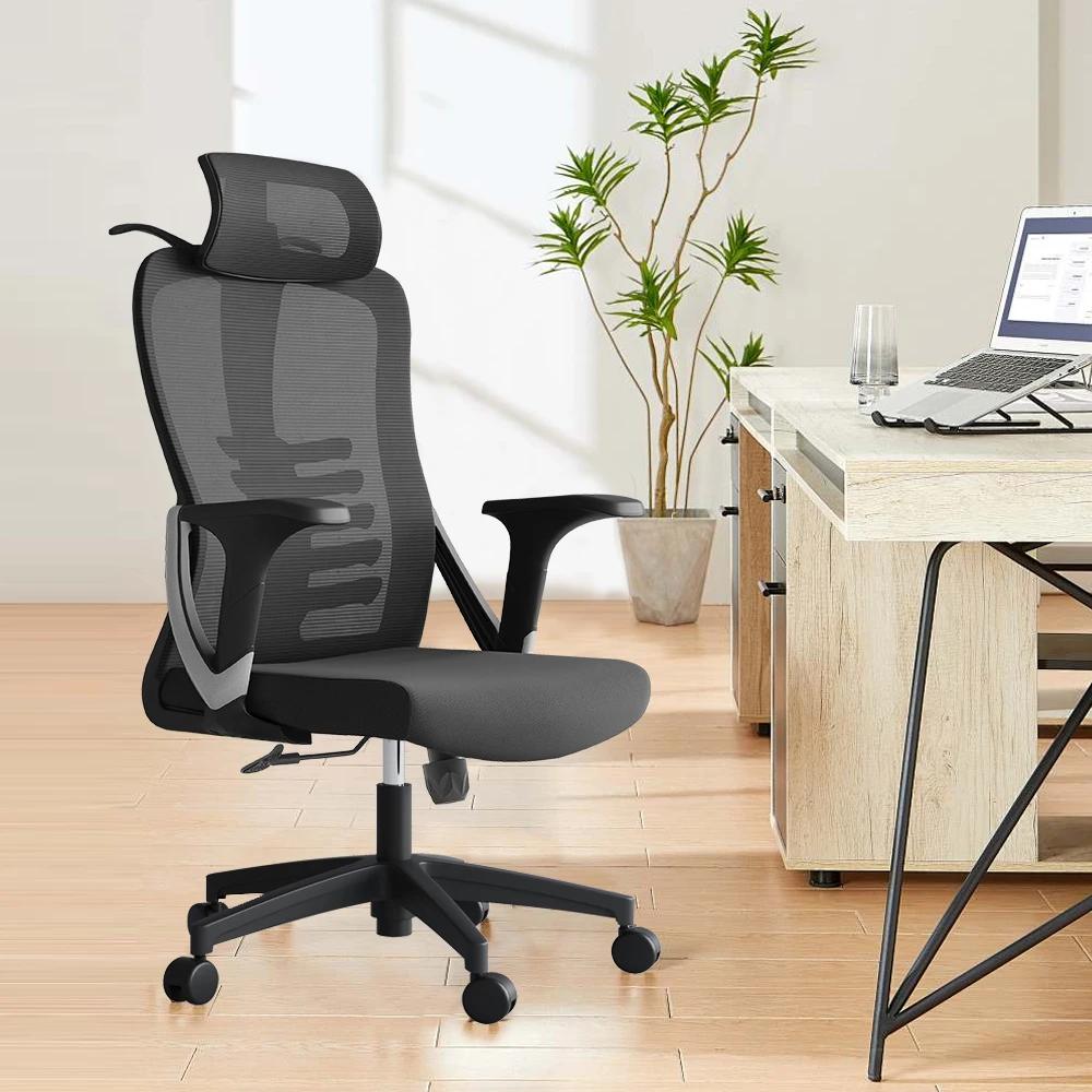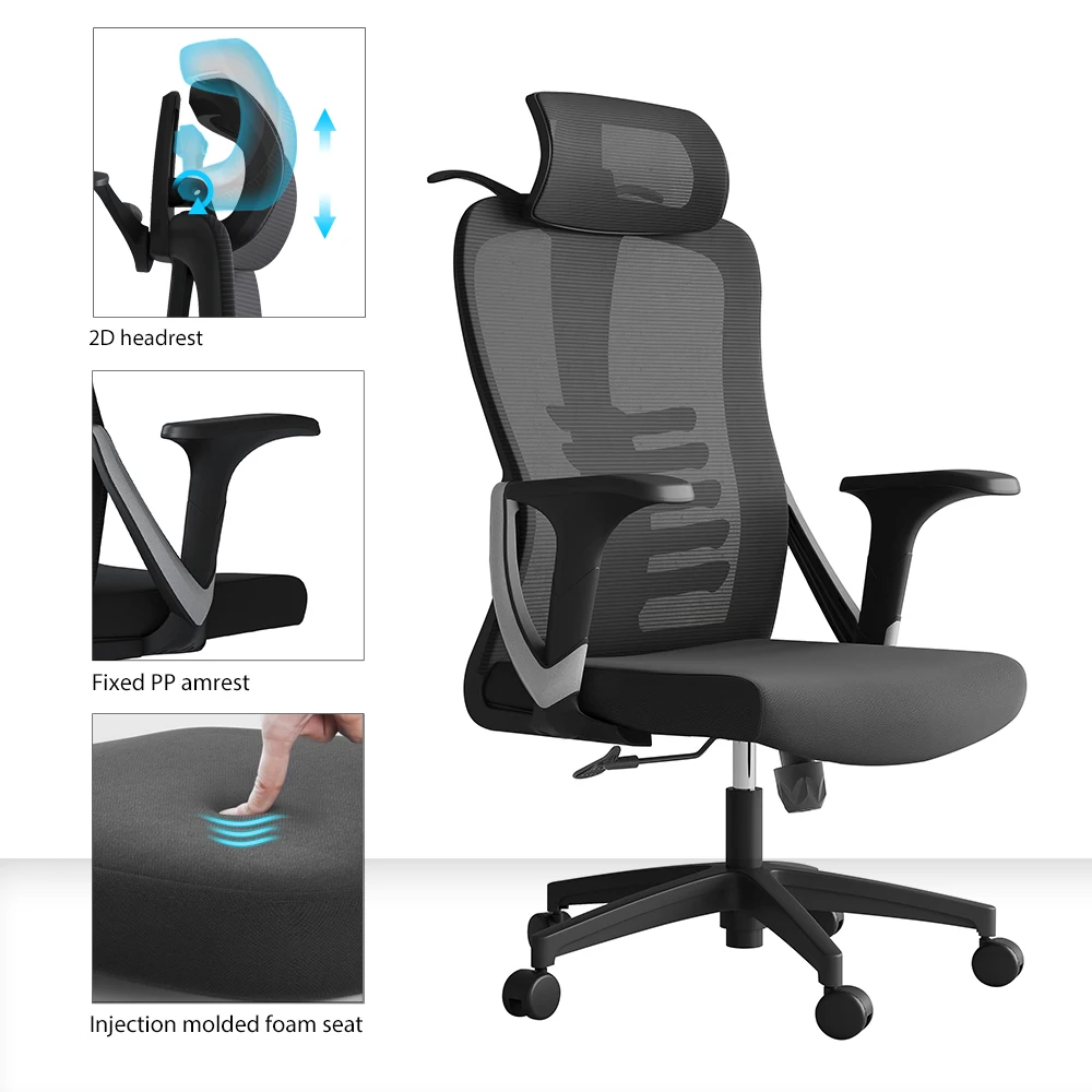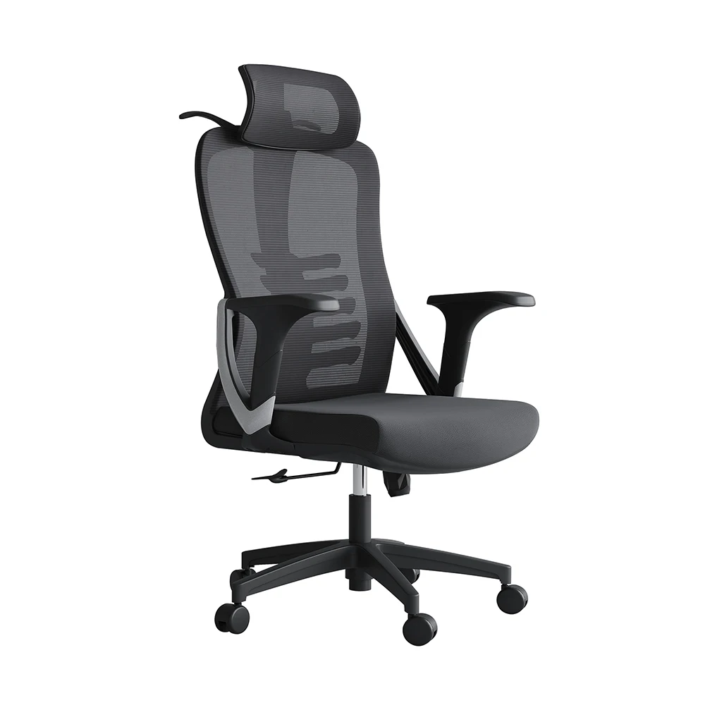 Cadeira ergonômica com encosto alto em malha, apoio de cabeça ajustável em 2D, assento acolchoado em espuma de alta densidade e suporte lombar regulável. Estrutura robusta e certificada pela BIFMA, ideal para uso prolongado com conforto e segurança.