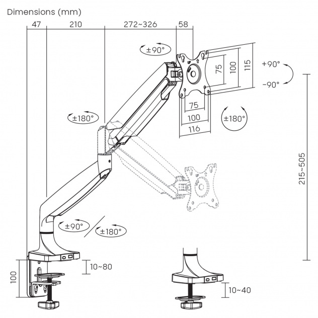 Montagem: Em borda de mesa (até 8cm de espessura) ou furo para cabos (Cable Management)