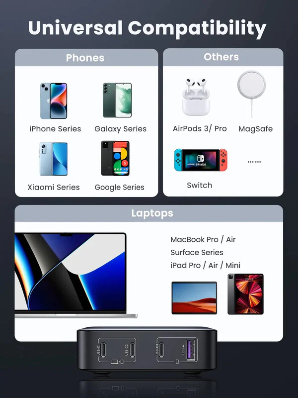USB-C: PD 3.0, PPS, QC 4+, QC 4.0/3.0, SCP (10V/2.25A), FCP, AFC, 5V/2.4A, BC1.2