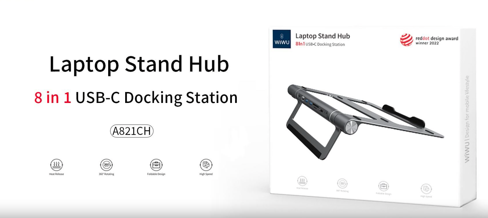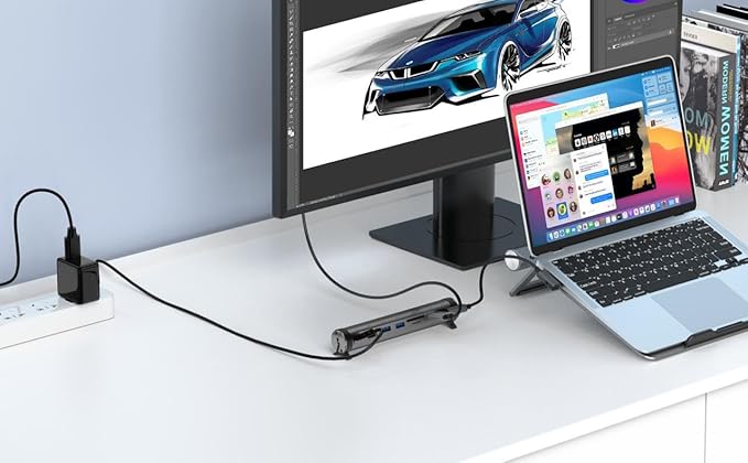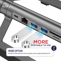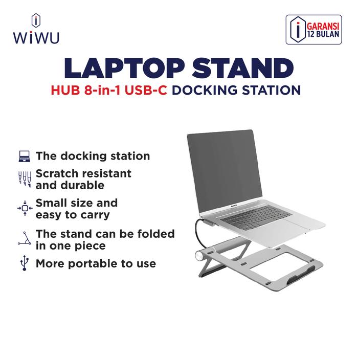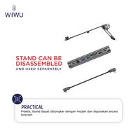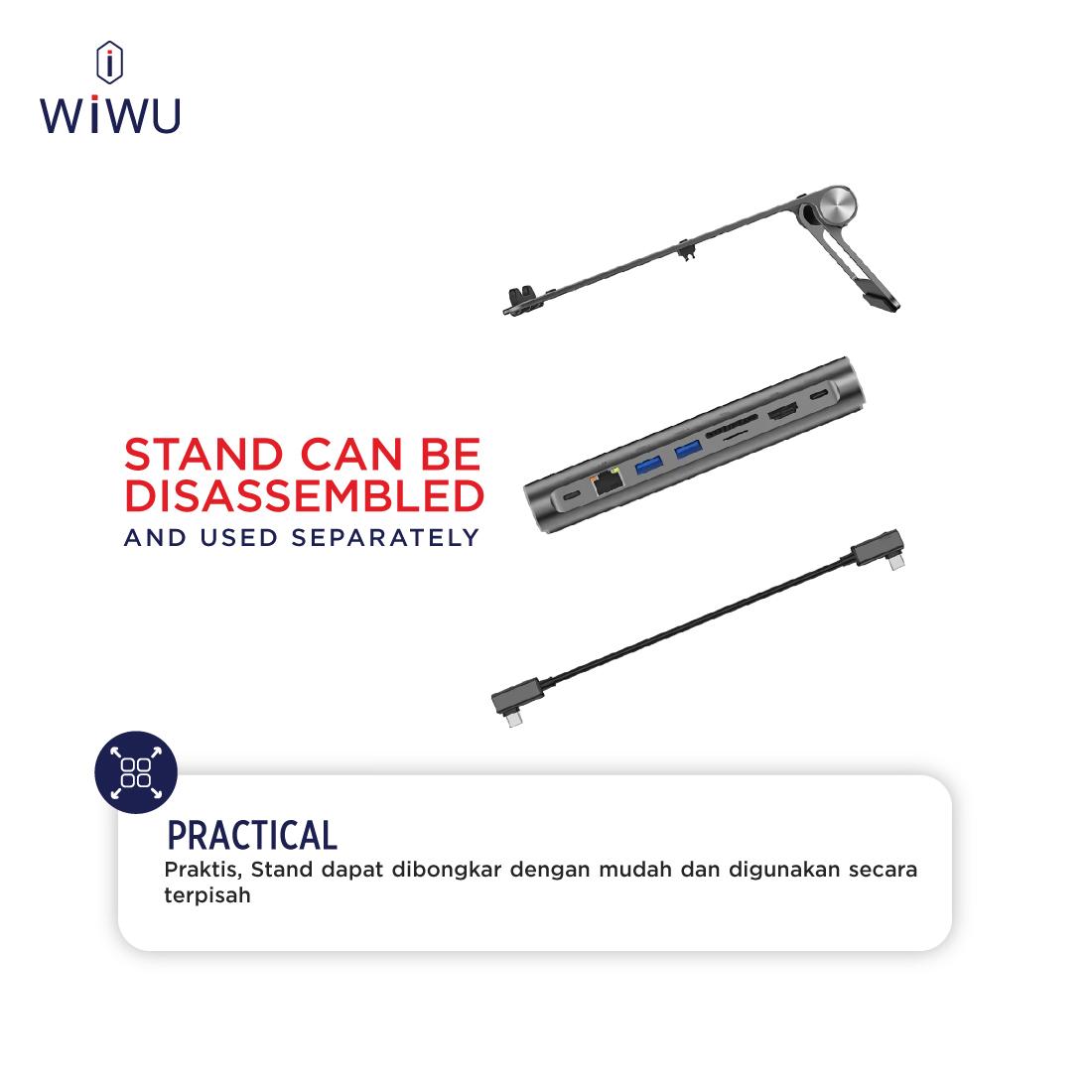 O dispositivo funciona como suporte ergonômico e como hub de expansão. O stand e o hub podem ser separados e usados independentemente, oferecendo flexibilidade máxima. Possui cabo USB-C integrado para conexão direta e prática.